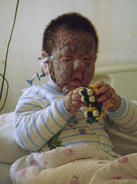 Shenyangissa asuvan Li Shenghanin erikoinen sairaus vaatii välitöntä kemoterapiaa, eikä pojan vanhemmilla ole varaa maksaa sitä itse. Hoidon arvioidaan maksavan noin 50.000 euroa, mutta perheen ansiot ovat vain 120 euroa viikossa. Pojan 33-vuotias äiti Mu Xiaojie on vedonnut kansainvälisiin lahjoittajiin poikansa puolesta. Järkyttävä tapaus onkin saanut viime päivinä hyvin näkyvyyttä mediassa ympäri maailmaa, mutta perhe ei ole vielä saanut kokoon hoitoon vaadittavaa rahasummaa. Lisätietoja avustuksen antamisesta tästä linkistä.
