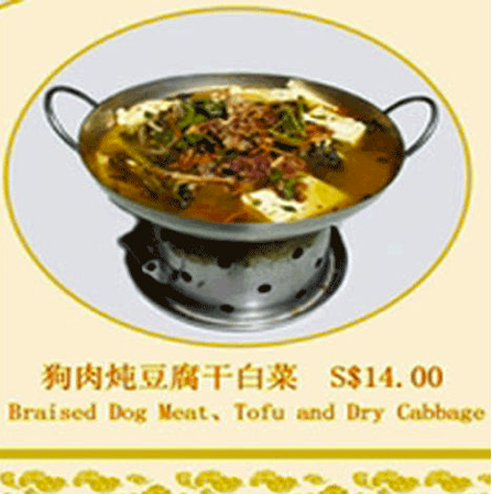 Singaporen minivaltiossa on nyt syntynyt suuri kohu, koska Song Hua Jiang -nimisen ravintolan ruokalistalle on ilmestynyt koiranlihaa sisältävä annos. Koiranlihan myyminen ravinnoksi on Singaporessa laitonta. Kyseessä oleva annos sisältää ”haudutettua koiranlihaa tofulla ja kaalilla”. Nyt kuvat ruokalistasta ovat levinneet nopeasti verkossa ympäri maailmaa.
