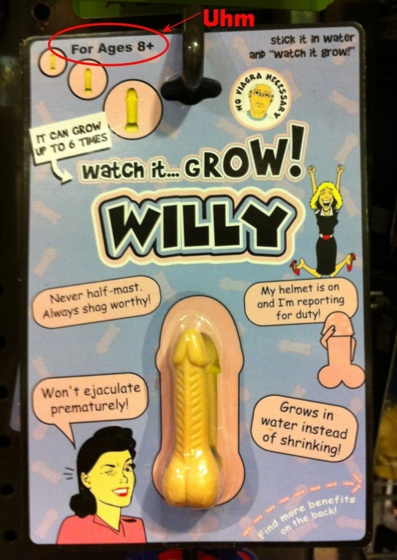 Lehdistössä ihmetellään parhaillaan kovasti kuinka kauppojen hyllyille on päätynyt ilmeisesti leikkikaluksi tarkoitettu penis, joka kaiken lisäksi vieläpä paisuu kasteltaessa. Tuote olisi varsin tavallinen pornokaupan hyllyssä, mutta sen pakkaukseen on kuitenkin painettu lelupakkausten tavoin suositusikäraja. Siinä todetaan, että penislelu sopii yli kahdeksanvuotiaille.