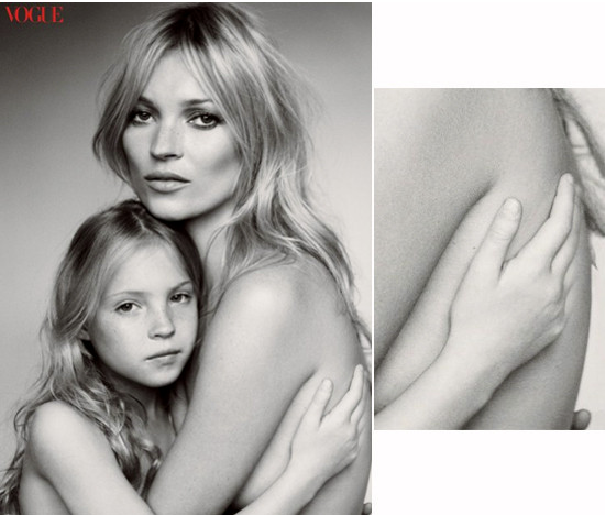 Nyt Kate Moss poseeraa Vogue-lehden syyskuun numerossa alastomana yhdessä Lila Grace -tyttärensä kanssa. Hellän halauskuvan kuvankäsittelyssä on kuitenkin sattunut pieni haaveri, kun tyttären sormet ovat jääneet tietokoneen leikkauspöydälle.