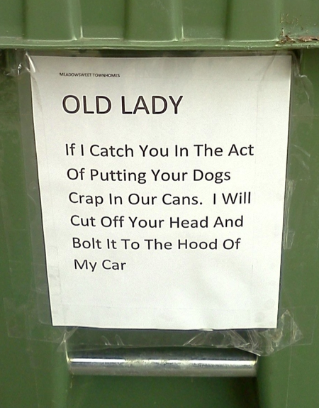 Ei siis ihme, että asia kuumentaa tunteita Suomen lisäksi myös maailmalla. Yhtä lailla tunteita kuumentavat myös ihmiset, jotka keräävät jätökset, mutta toimittavat ne naapureiden roskiksiin. Nyt eräässä tapauksessa joku naapureista on suivaantunut mummolle, joka kantaa koiransa jätökset väärään laatikkoon. Tarpeeksi monen kerran jälkeen roskalaatikkoon ilmestyi poikkeuksellisen raju uhkaus.
