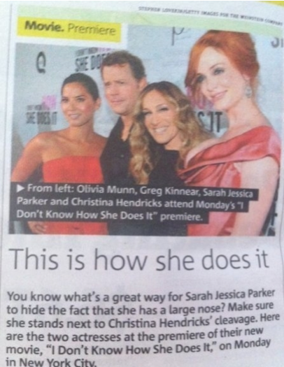 Nyt 36-vuotias punapää varasti kaiken huomion pulleilla purjeillaan I Don’t Know How She Does it -elokuvan ensi-illassa. New Yorkin Metro-lehti teki juhlista jutun sivuilleen, ja lehtikuvassa näyttää siltä, että elokuvan päätähti Sarah Jessica Parker yrittäisi piiloutua povipommin varustuksen taakse.
