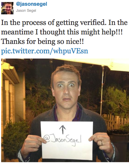 Amerikkalainen näyttelijä-tuottaja Jason Segel päätti äskettäin ryhtyä kirjoittamaan elämästään Twitter-blogissa. Hän oli kuitenkin niin tunnettu henkilö, että tilin avaaminen omalla nimellä ei onnistunutkaan niin kovin helposti. Lopulta mies keksi loistavan keinon vahvistaa olevansa itse avaamassa käyttäjätiliä, sillä hän lähetti ylläpidolle kuvan itsestään ja haluamansa tilin tunnuksesta. Se auttoi, ja nyt Segel on päässyt mikrobloggaamisen makuun.