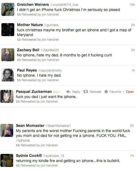 Twitter-mikroblogissa monet amerikkalaisnuoret ovat nimittäin purkaneet pettymystään siitä, että heidän vanhempansa eivät olleet hankkineet pukinkonttiin Applen iPhonea tai iPadia. Monet saivat esimerkiksi kilpailevien merkkien tuotteita, jotka eivät kuitenkaan lahjoiksi kelvanneet.