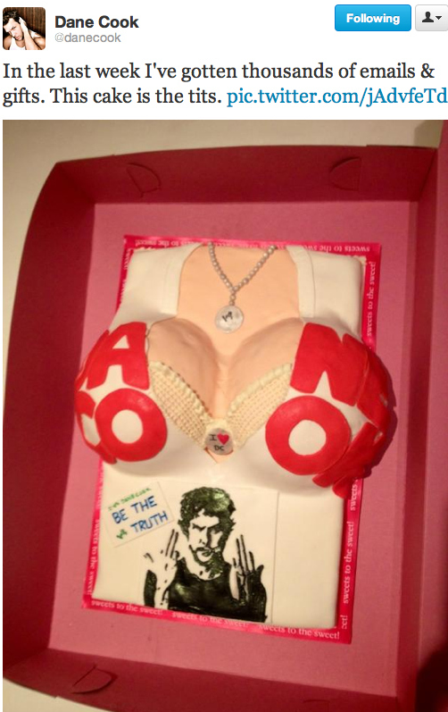 Kyseessä ei ole aivan mikä tahansa täytekakku, vaan nimenomaan naisen rintamuksen muotoon tehdystä luomuksesta. Viestissään Dane Cook kertoi saaneensa kuluneen viikon aikana tuhansia sähköposteja ja lahjoja, joten niitä oli aihetta myös juhlia. Äskettäin monet julkkiksetkin paheksuivat Cookin rajua stand up -keikkaa julkisesti.
