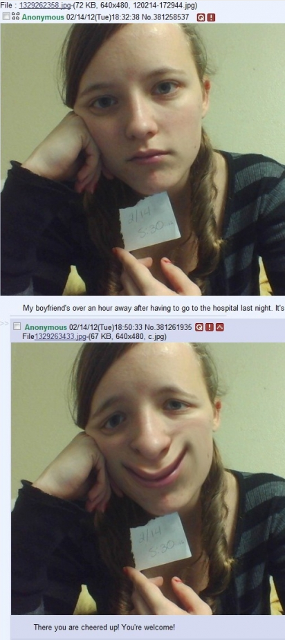 Toive ei tosin todennäköisesti toteutunut aivan siten kuin neitokainen oli toivonut, sillä kyse oli tällä kertaa aidon piristämisen sijaan vain kuvankäsittelystä. Joka tapauksessa samainen kuva on sittemmin piristänyt varmasti jo miljoonien muiden päivää.