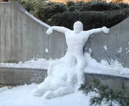 Kuvasarjan rivoimpien lumiteoksien joukkoon lukeutuu lumiveistos, jossa luminainen on polvistunut lumiukon haarojen väliin härskeissä merkeissä. Kuvakoosteessa näytetään myös kuva lumiukosta, jonka edessä olevassa paperitaulussa lukee teksti ”kuolen kohta”. Kuvissa nähdään myös Connecticutissa taiteiltu lumiteos, joka muistuttaa ulkovessaa.