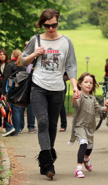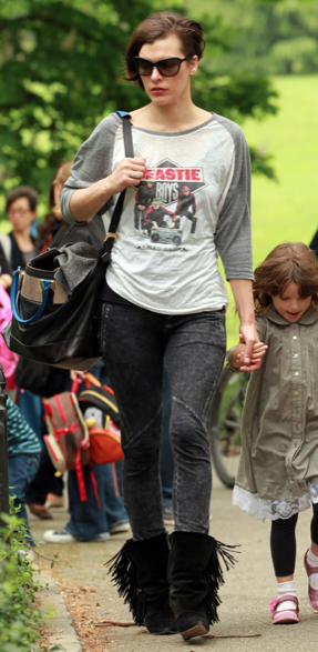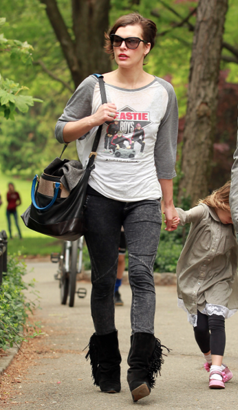 Milla aiheutti taannoin kohua, kun hänen elokuvansa nakukuvat päätyivät julkisuuteen. Nyt hoikka kaunotar on kuvattu ulkoilemassa tyttärensä kanssa New Yorkin Keskuspuistossa. Samalla Milla kunnioitti äskettäin edesmenneen Beastie Boys -yhtyeen Adam Yauchin muistoa yhtyeen paidalla.