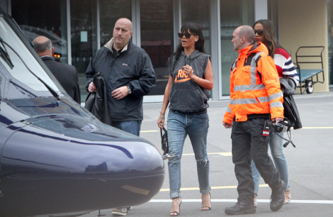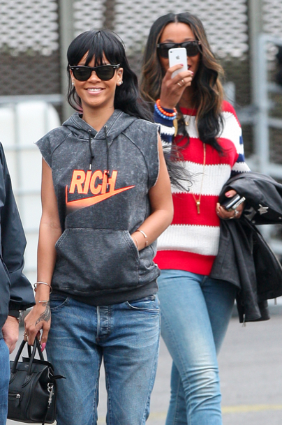 Nyt Rihanna on kuvattu Lontoossa sijaitsevalla helikopterikentällä ystävänsä Melissa Forden kanssa. Poptähti lensi O2 Arenalle, jossa esiintyivät Kanye West ja Jay-Z. Rihanna oli pukeutunut reissuaan varten hihattomaan huppariin, jossa luki RICH.