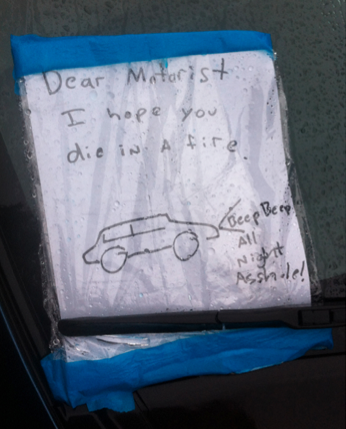 Kuvissa nähdään muun muuassa, kuinka eräs henkilö on jättänyt auton pyyhkimien alle paperilapun. Lapussa hän kertoo kyseisen auton varashälyttimen soineen koko päivän ajan. Viestin kirjoittaja haukkuu tekstissään auton omistajan pyytää tätä joko vaihtamaan surkean romuläjänsä tai muuttamaan pysyvästi Kanadaan.