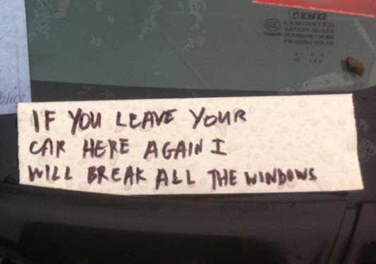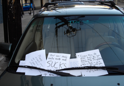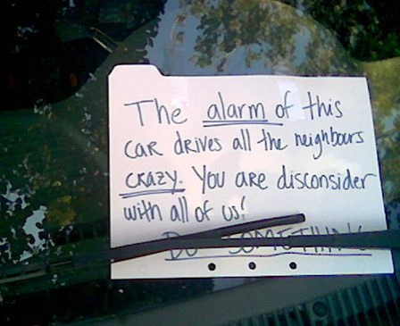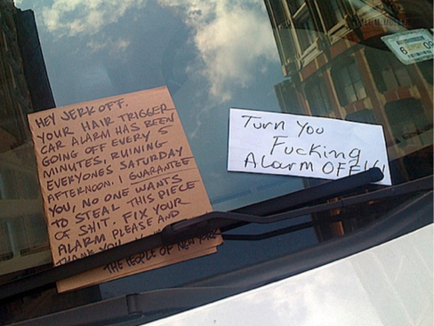 Kerrostaloalueilla väärin pysäköityjen autojen tuulilaseissa voi nähdä silloin tällöin ärsyyntyneiden naapureiden kirjoittamia ärtymystä pursuavia viestejä. Väärin pysäköinnin lisäksi myös alituisesti hälyttävät varashälyttimet ärsyttävät monia.