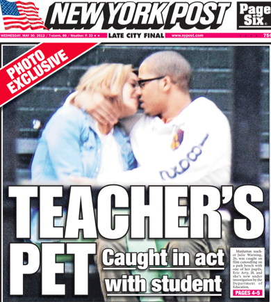 Nyt eräs juuri tällainen pari on jäänyt kiinni rysän päältä, kun silminnäkijä kuvasi heidät kuhertelemassa New Yorkin keskuspuistossa Manhattanilla. 26-vuotias opettaja Julie Warning ja 18-vuotias oppilas Eric Ary nähdään kuvissa suutelemassa toisiaan.