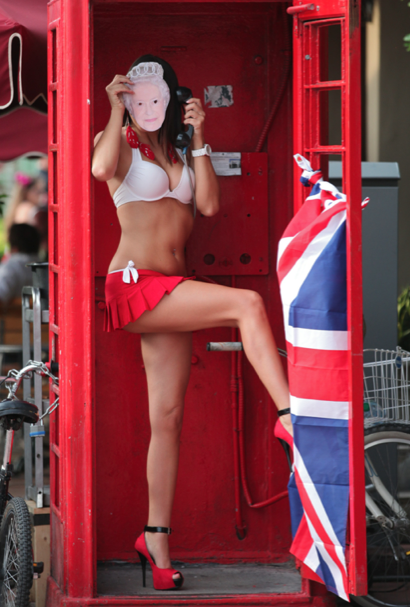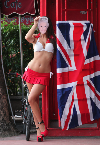 Nyt kaunotar ei kuitenkaan keikistellyt kameroille rannalla, vaan esiintynyt vähäpukeisena perinteisen englantilaisen puhelinkopin edessä lippu mukanaan. Englannin kuningatar on juhlinut tällä viikolla näyttävästi, ja sen kunniaksi Claudia onkin asettanut kasvoilleen kuningattaren naamarin. Tempausta ei ole pidetty hyvän tavan mukaisena.