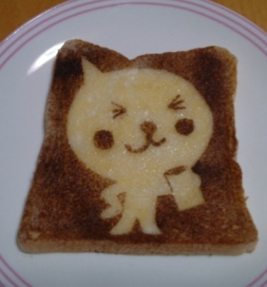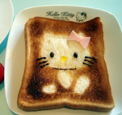 Kuvissa nähdään muun muuassa tummunut paahtoleipä, jonka keskelle on taiteiltu monen pienen tytön lempihahmo. Leivässä nimittäin nähdään Hello Kitty -kissahahmoa muistuttava taideteos, joka on viimeistelty mustilla pisteillä ja viivoilla sekä pinkillä rusetilla.