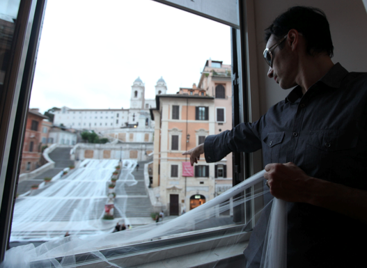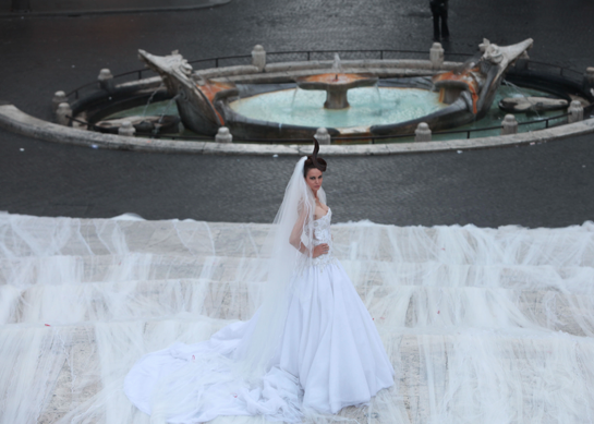 Eräs heistä on nyt esitellyt hääpukuaan Roomassa. Kaupungin keskustan tunnetuimpiin maamerkkeihin lukeutuvat espanjalaiset portaat saatiin peitettyä kokonaan hääpuvun huiman pitkällä laahuksella. Puku on Gianni Molaron suunnittelema ja sen laahuksen kerrotaan olevan kahden mailin, eli noin 3,2 kilometrin pituinen.