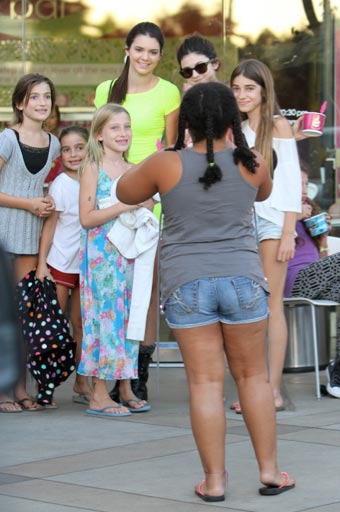 Parhaillaan Beverly Centerin mainoksessakin poseeraava 16-vuotias Kendall Jenner on nyt kuvattu shoppailemassa 14-vuotiaan pikkusiskonsa Kylie Jennerin kanssa Calabasissa. Häikäisevän kirkkaanväriseen pikkumekkoon sonnustautunut nuori kaunotar erottui joukosta hyvin myös muutenkin kuin pituutensa ansiosta. Samalla hän pääsi poseeraamaan myös fanien yhteiskuvassa.