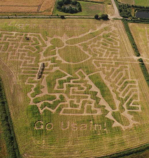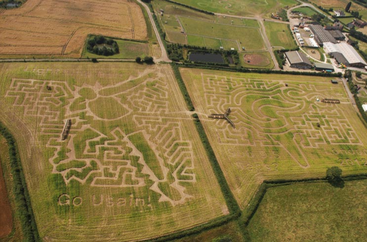 Brittiläinen maanviljelijä Tom Robinson on nimittäin tehnyt mailleen valtavan teoksen, jonka keskeisessä osassa nähdään Usain Bolt ja teksti ”Go Usain!”. Teos vie maissipeltoa peräti viiden hehtaarin verran ja se sijaitsee Burton-Upon-Trentin liepeillä Englannissa. Kuvaa varten on tehty yhteensä viiden kilometrin verran ”ääriviivaa”.