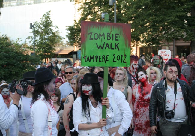 Eilen Tampereen keskustassa järjestettiin samanaikaisesti useita yleisötapahtumia, joten keskustassa oli poikkeuksellisen paljon ihmisiä. Eräs tapahtumista oli etukäteen varsin vähälle huomiolle jäänyt perinteinen Zombiewalk, joka säikäytti monet tempauksesta tietämättömät.