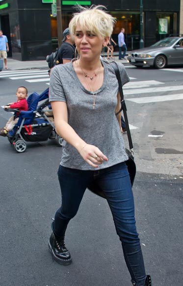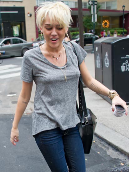 Cyrus kuvattiin eilen Philadelphiassa, jossa hänet nähtiin uudessa lyhyessä tukassaan ja ohuessa harmaassa t-paidassa. Paidan alle neitokainen ei ollut tuttuun tapaansa pukenut lainkaan rintaliivejä, joten hän pääsi nauttimaan paparazzeilta saamastaan jakamattomasta huomiosta.