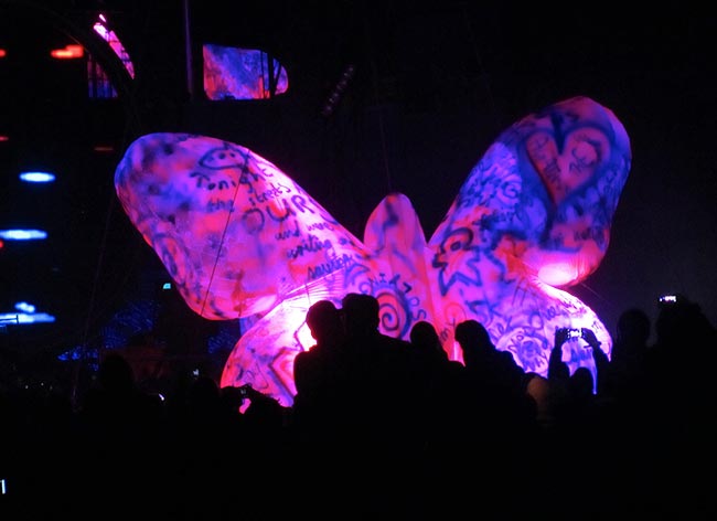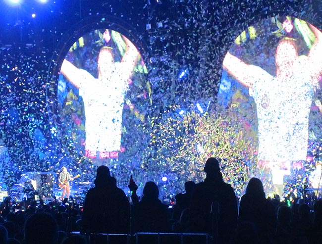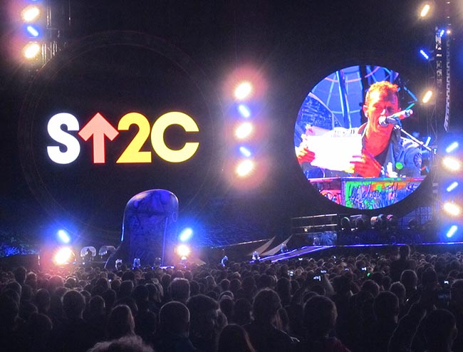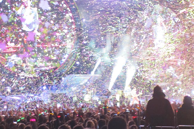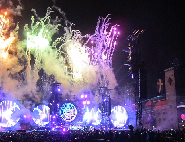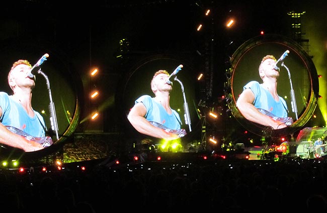 Täyteen pakattu stadionillinen ihmisiä sai todistaa kuinka yhtyeen keikka alkoi Jay-Z:n 99 Problems -kappaleella, jonka aikana yleisön tuli asettaa ranteisiinsa portilla jaetut kuuluisat led-rannekkeet. Jokaiselle katsojalle annettavat rannekkeet ovat yhtyeelle valtava kuluerä, mutta keikan visuaalisuuden kannalta niillä on valtava vaikutus.