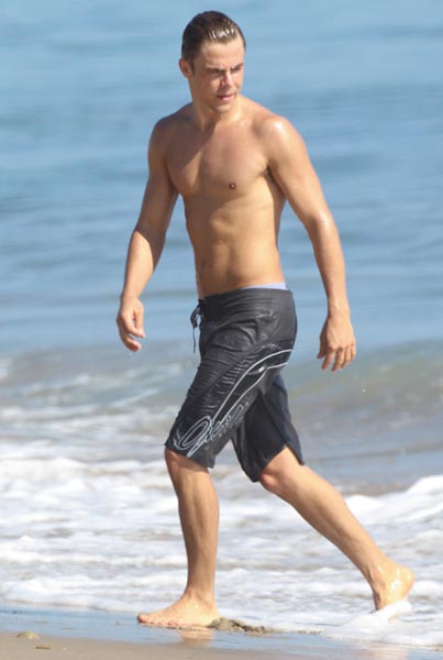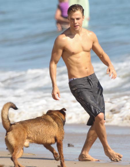 Nyt 27-vuotias Derek Hough kuvattiin nauttimassa aurinkoisesta rantapäivästä ystäviensä kanssa. Malibussa rentoutunut tanssijatähti innostui muun muuassa leikkimään Romeo-koiransa kanssa rantahiekalla. Lisäksi hän esitteli treenattua vartaloaan rantalentiksen merkeissä.