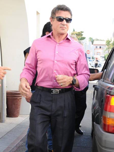 Nyt Stallone on kuvattu siviilipuuhissa Beverly Hillsissä, jossa hän käväisi kahvilla Aroma Cafessa yhdessä muutaman muun miehen kanssa. Syltty oli pukeutunut visiittiä varten vaaleanpunaiseen kauluspaitaan.