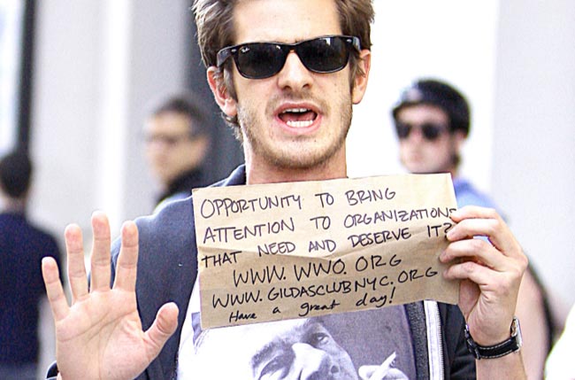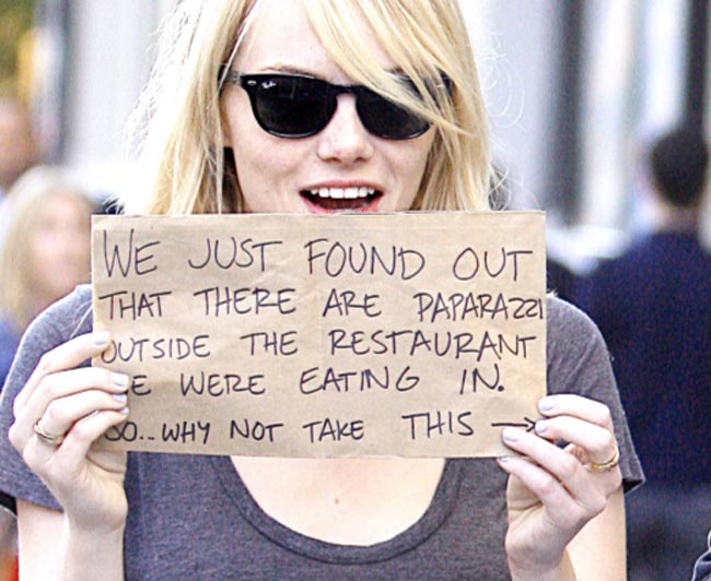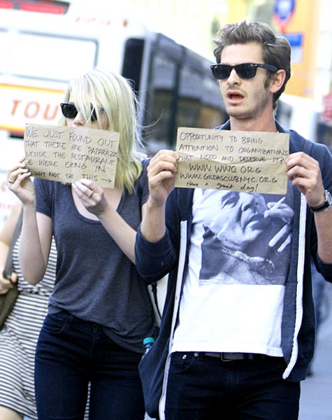 Emma Stone seurustelee toisen nosteessa olevan nuoren näyttelijän, 28-vuotiaan The Amazing Spider-Man -tähti Andrew Garfieldin kanssa. Pariskunta nähtiin launtaina lounastamassa newyorkilaisessa ravintolassa. Tämä houkutteli paikalle paparazzeja, jolloin pari keksi ovelan keinon käyttää kuvaajia hyväkseen. Emma ja Andrew kävelivät ravintolasta ulos pidelleen kasvojensa edessä pahvikylttejä, joissa nämä kannustivat ihmisiä vierailemaan internetin hyväntekeväisyyssivustoilla.