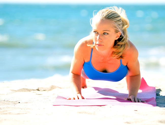 27-vuotias Playboy-pupu on nyt kuvattu voimistelemassa joogatunnelmissa rannalla. Hänet kuvattiin Los Angelesin liepeillä Santa Monican rannalla siniseen tiukkaan toppiin ja mustiin housuihin sonnustautuneena.
