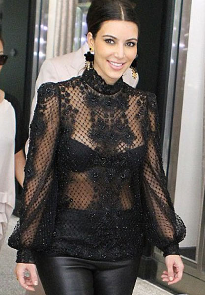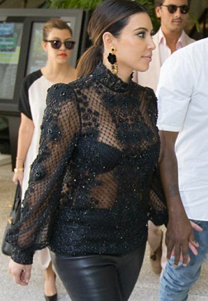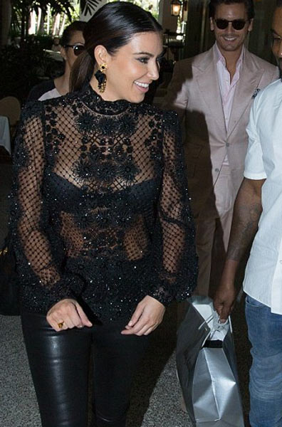 Nyt 31-vuotias Kim Kardashian ikuistettiin paparazzien kameroille Miamissa. Brunette oli valinnut ylleen nahkaiset housut ja läpinäkyvän paidan. Neitokaisen mustat rintaliivit olivatkin paitavalinnan vuoksi kaikkien nähtävillä. Otoksissa nähdään myös Kimin sisko ja tämän avopuoliso.