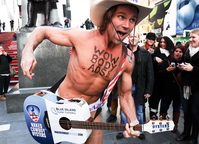 41-vuotias The Naked Cowboy, oikealta nimeltään Robert John Burck, on nyt tehnyt sopimuksen WoWBodyAds.com -yrityksen kanssa paljaan ihonsa myymisestä mainostilaksi. Jatkossa miehen selässä ja rinnassa tullaankin näkemään maksettuja mainoksia. Vaikka miehen taiteilijanimi viittaa alastomuuteen, on hänellä silti alushousut jalassaan.