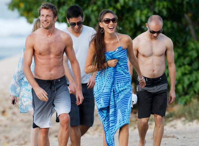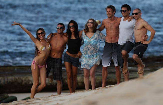 Äskettäin maratonin juossut Jenson Button juhlii parhaillaan saavutustaan Havaijilla yhdessä ystäviensä ja mallitason tyttöystävänsä Jessica Michibitan kanssa. Paparazzi ikuisti koko seurueen nauttimassa rennosta rantatunnelmasta.