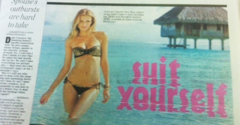 Viihdeuutiset 6.5.2012, 9:00 Lehden grafiikassa p**kamainen moka: ”Ulosta päällesi” Viime aikoina olemme kertoneet lukuisista tapauksista, joissa malli- ja mainoskuvien