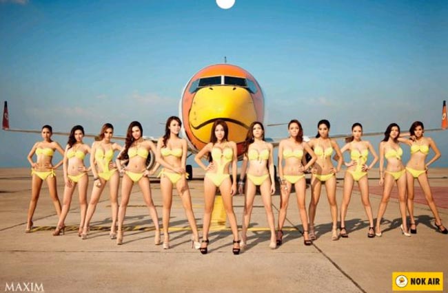 Nok Air -lentoyhtiön tuore kalenteri esittelee joukon Maxim-lehden malleja, jotka poseeraavat vähissä vaatteissa yhtiön lentokoneiden ympärillä. Yhdessä kuvassa 12 kaunotarta poseeraa lentokoneen edessä keltaisissa bikineissä. Kohua herättävät kuvat ovat nähtävillä yhtiön Facebook-sivuilla.