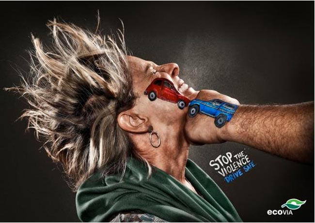 Ihmisten käsiin on piirretty ajoneuvoja, jotka törmäävät toisiinsa nyrkin iskeytyessä kasvoihin. Kampanja on näyttävä, vaikka hieman samaa ideaa onkin käytetty jo aiemmin useissa maissa.