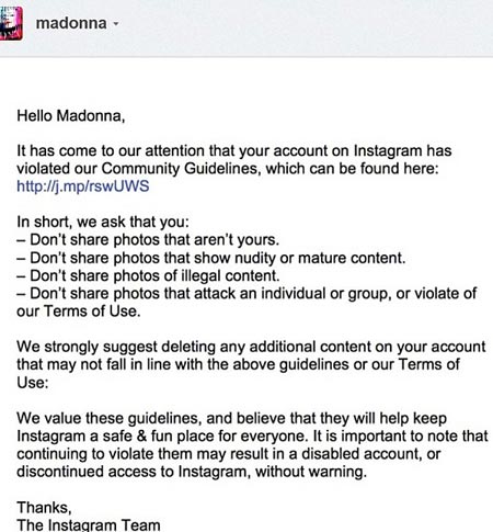 54-vuotiasta tähteä muistutetiin Instagramin tiimin puolesta siitä, ettei hän voi julkaista profiilissaan aivan mitä tahansa otoksia. Madonnan kuvat ovat jo rikkoneet sopivuutta, minkä vuoksi häntä muistutetaan palvelun säännöistä. Laulajatar menikin seuraavaksi julkaisemaan kyseisen kirjeen seuraajiensa luettavaksi.
