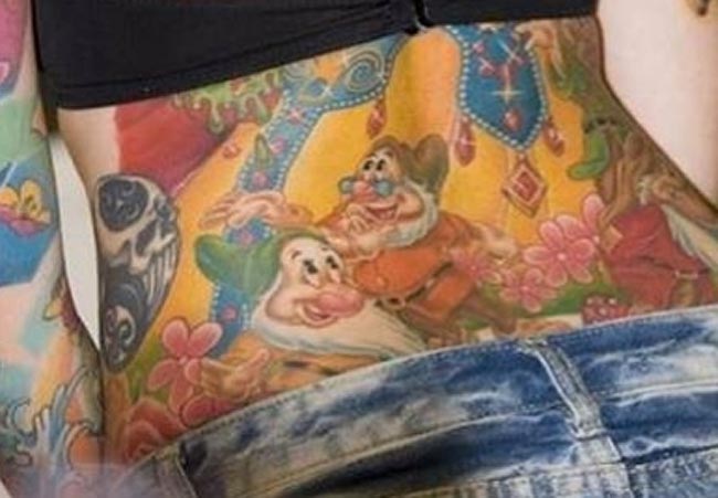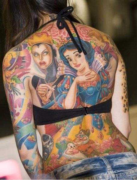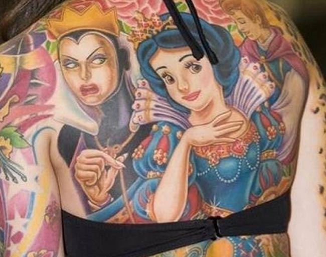 Uskomattoman näyttävässä tatuoinnissa nähdään Lumikki ja suuri joukko tarinan hahmoja sekä lisäksi myös muun muassa ruusuja ja muita kukkia. Kuvan on julkaissut verkossa alan sivusto www.tattoo-teez.com, mutta tatuoinnin tekijää ei kuitenkaan kerrota.
