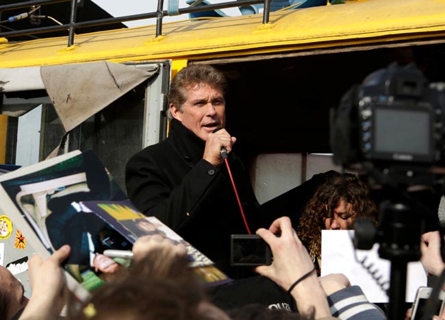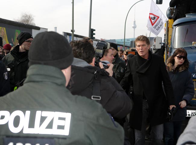 Hasselhoff antaa muurin säilyttämiselle täyden tukensa. Hän lupaa, että mikäli muurin purkamisuhka etenee seuraavalle tasolle, järjestää hän paikalla valtavan rock-konsertin. Viranomaiset ja aktivistit tekevät muurin kohtalosta kompromissin ensi viikolla, Huffington Post arvioi.