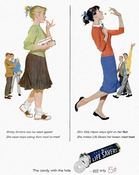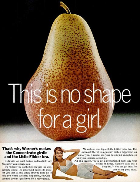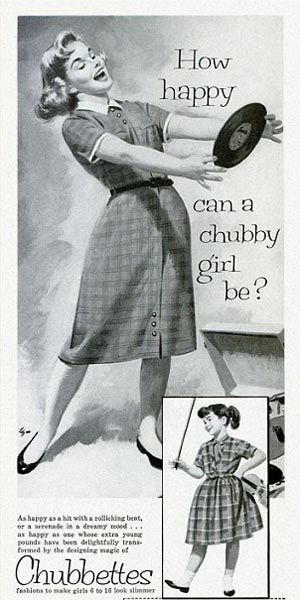 Nyt Daily Mail on kaivanut arkistojen kätköistä koko joukon takavuosien lehtimainoksia, joiden sloganit kertovat hyvin ajankuvasta. Mainoksissa muun muassa arvuuteellaan, että ”Voiko pullukka tyttö olla onnellinen?” ja todetaan, että päärynän muoto ei ole tyttöjä varten. Nykyisin tällaiset mainokset eivät luonnollisestikaan menisi läpi edes Britanniassa.