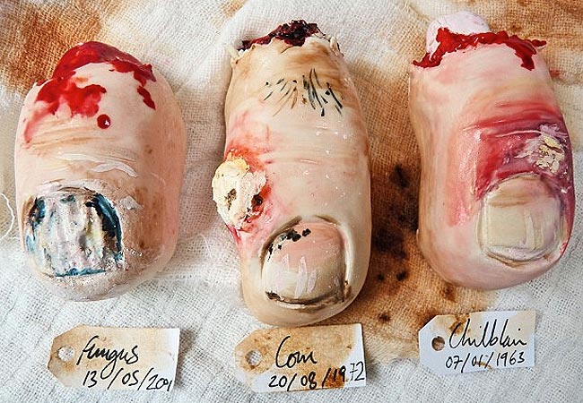Olemme aiemminkin kertoneet vastaavista herkuista, mutta nyt myös brittiläinen Nevie-Pie Cakes osallistui anatomia-aiheiseen Eat Your Heart Out -tapahtumaan monenkirjavalla kakkukavalkadillaan. Kondiittorien hyppysistä valmistui muun muassa iljettävän näköisiä kynsisienivarpaita, tupakantumpeilla vuorattuja kakkuja ja pikkupurtavaksi irtokorvia.