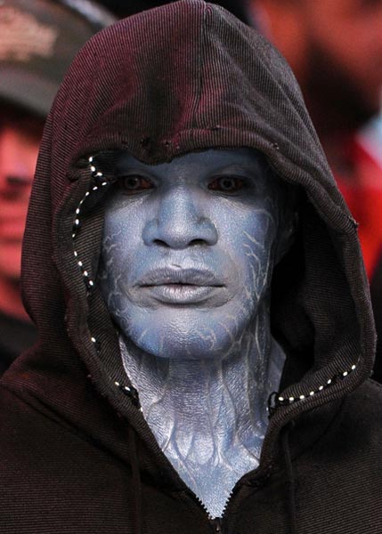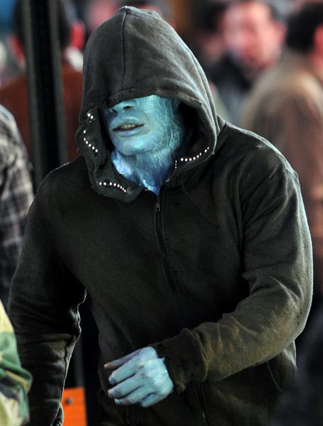Näyttelijä on nyt päätynyt elokuvan kuvauspaikalta otettuihin otoksiin rooliinsa valmistautuneena, maskeerauskerroksen peittämänä. Foxxia onkin vaikea tunnistaa hurjan näköisen sähkönsinisen olemuksen ja päätä peittävän hupun alta.