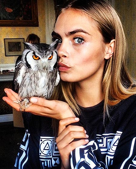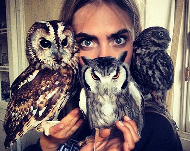 Cara Delevingne on jälleen osoittanut omistavansa erikoisen huumorintajun. 20-vuotias mallikaunotar jakoi Instagramissa kolme kuvaa, joista kahdessa hän poseeraa pöllöjen kanssa. Kuvista ei selviä, ovatko pöllöt hänen lemmikkejään, mutta ainakin ne tuntuvat sopivan hyvin tuuheista kulmakarvoistaan tunnetun Delevingnen seuraan.