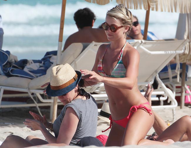 Nyt Julianne on kuitenkin viettänyt lomaa Floridassa, Miami Beachilla ystävänsä Nina Dobrevin kanssa. Tällä kertaa paparazzin haaviin päätyi seksikäs Hough, joka oli verhonnut bikinikroppansa värikkääseen uima-asuun. Hänen peppunsa muodot tulivat hyvin esille stringibikineissä.