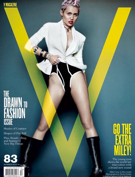 Hiljattain antoisassa kaula-aukossa Elle-lehdessä poseerannut Miley Cyrus nähdään nyt jälleen rohkeissa kuvissa. 20-vuotias tähti poseeraa V Magazine -lehden tuoreen numeron kolmessa erilaisessa kannessa esimerkiksi avonaisessa takissa ilman rintaliivejä.