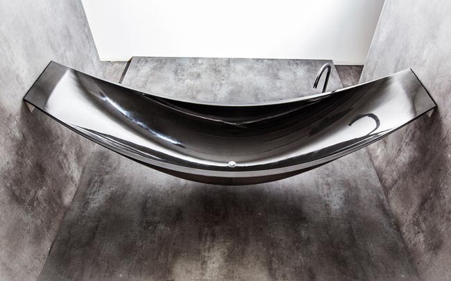 Kyseessä on hiilikuidusta valmistettu Vessel-niminen kylpyamme, joka rikkoo kaikki aikaisemmat tyylit. Brittiläisen SplinterWorks-yrityksen suunnittelema tuote on nimittäin tehty riippumaton muotoiseksi ja ilmassa roikkuvaksi.