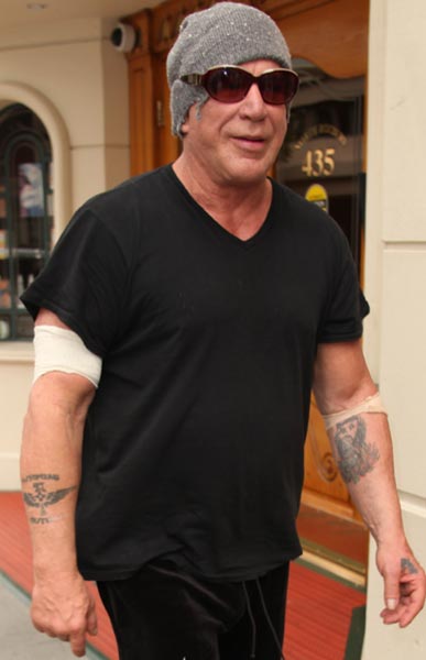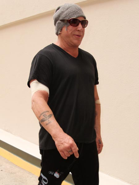 Taannoin Mickey Rourke julkaisi shokeeraavia valokuvia, joissa hänen kasvonsa näyttivät kuin mies olisi hakattu pahemman kerran. Kasvojen korjausleikkaukset ovat nyt takana, mutta liiallisten kauneusleikkausten tuhoja ei ole saatu kovin hyvin korjattua. Nyt Rourke kuvattiin kävelyllä Beverly Hillsissä.