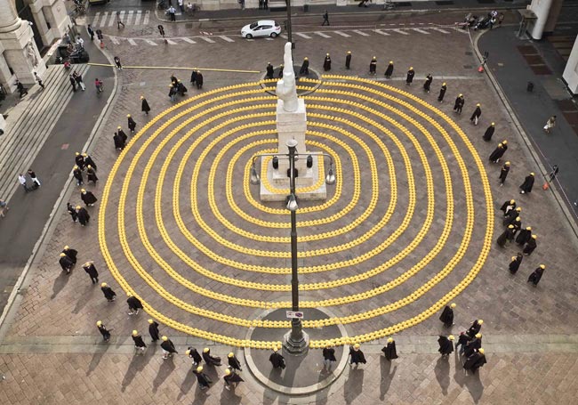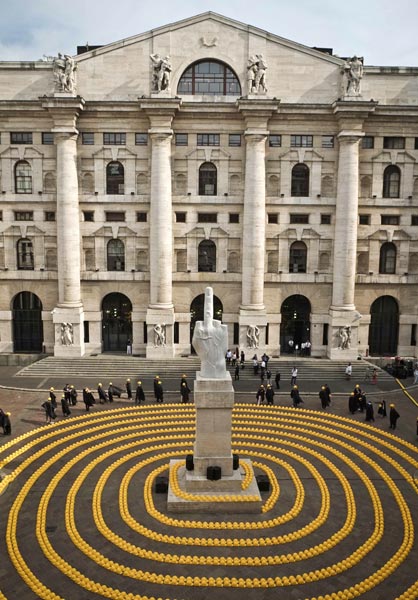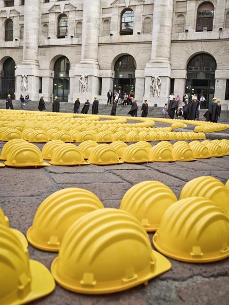 Rakennustyöläiset toivat sadoittain keltaisia kypäriä Piazza Affarille, jossa ne järjesteltiin tyylikkäiksi ympyröiksi aukion keskellä olevan patsaan ympärille. Entisen pörssitalon edustalle kootut kypärät kuvasivat ”pohjalle vievää pyörrettä”.