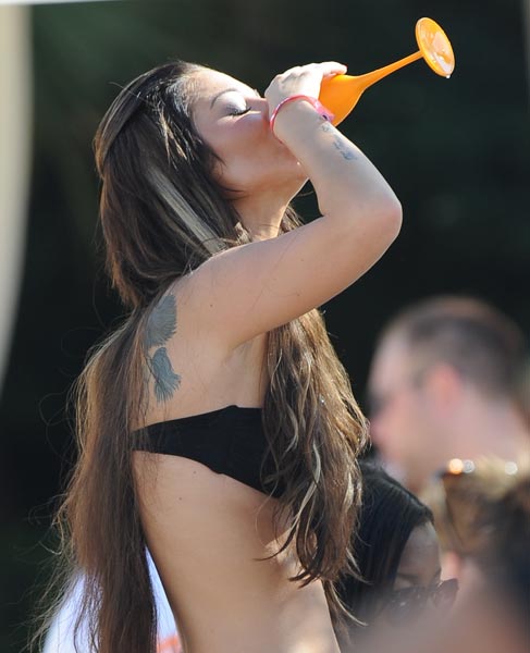 Eilen Tulisa kuvattiin ystäviensä kanssa juhlimassa railakkaasti Oceans Beach Clubilla järjestetyissä bikinibileissä, joissa shampanja virtasi ja housemusiikki raikasi. Tulisalla oli kemuissa yllään tyylikkäät mustat bikinit.