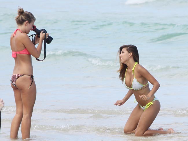 Toissapäivänä Devin Brugman kuvattiin keikistelemässä rannalla bikineissä yhdessä ystäviensä kanssa. Vaikka kaunotar oli rannalla viettämässä vapaapäivää, joutui hän silti keikistelemään kameran edessä.