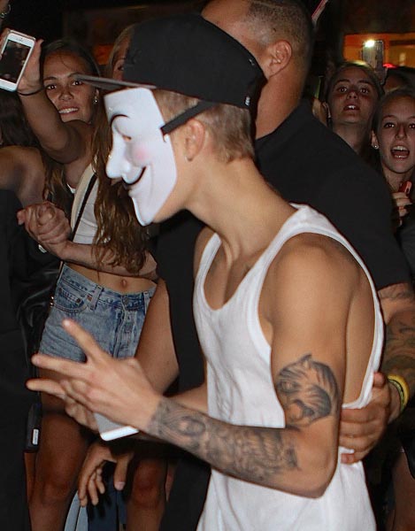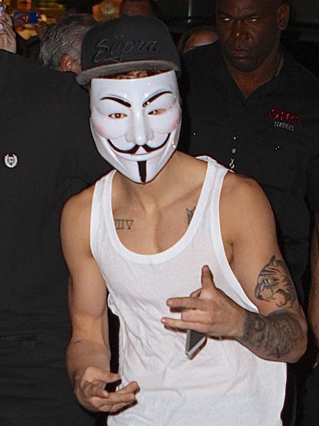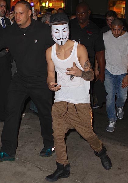 Samalla on noussut uudelleen otsikoihin myös Bieberin parin viikon takainen tempaus, jossa hänet nähtiin poseeraamassa faneilleen naamari kasvoillaan. Teinitähti esiintyi yleisölle V niin kuin verikosto -elokuvasta tutussa naamarissa. Justin Bieber yritti pelotella naamarilla fanejaan samalla, kun hän palasi New Yorkin hotellille keikaltaan.
