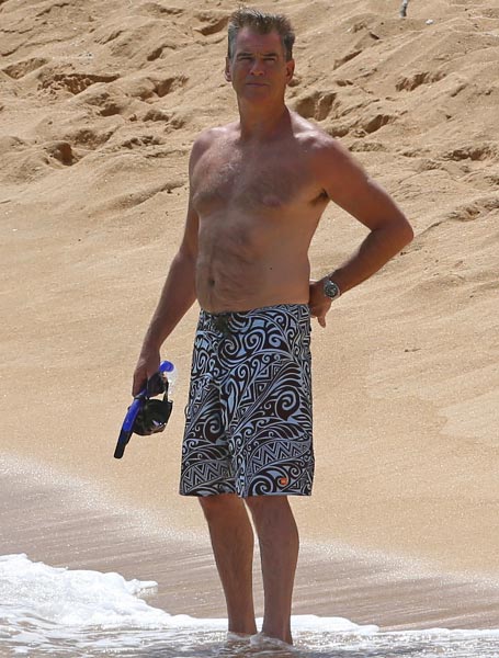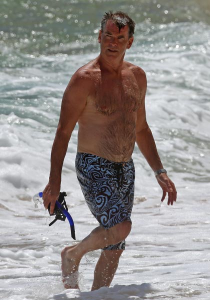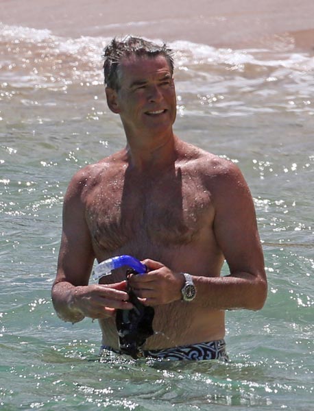 Brosnan lomaili Yhdysvaltojen paratiisisaarella yhdessä vaimonsa Keely Shaye Smithin kanssa. Pariskunta polskutteli ja snorklasi meressä. Pierce on kerryttänyt silminnähden ikääntyneen miehen charmia ulkonäköönsä ja hän intoutui vilkuttelemaan faneilleen.